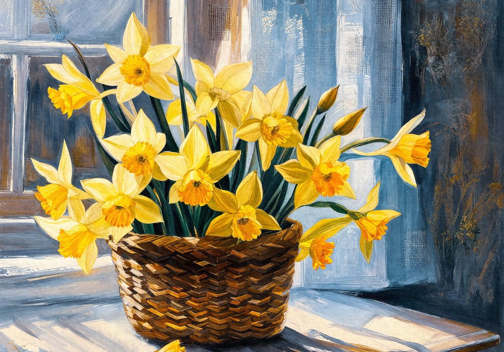 In the soft light of early spring, a willow basket cradles a burst of golden jubilation. The daffodils unfurl their delicate petals, each bloom a sunburst of hope emerging from t...