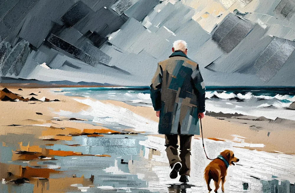 The old man's footprints trail behind him in broken parallel with his dog's paw marks, twin signatures soon to be erased by the tide. His wool coat, the color of weathered driftwoo...