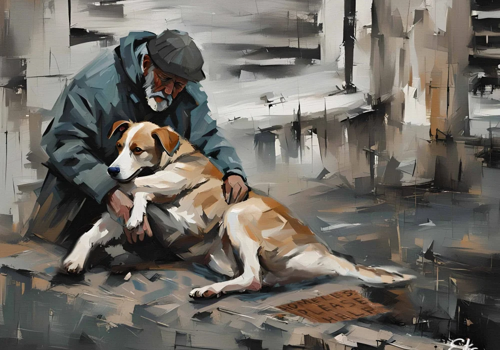 A shaft of sunlight, a fugitive from the urban canyon, slices through the grimy alleyway, illuminating a tableau of stark desolation. Huddled against a cold brick wall, a man sit...