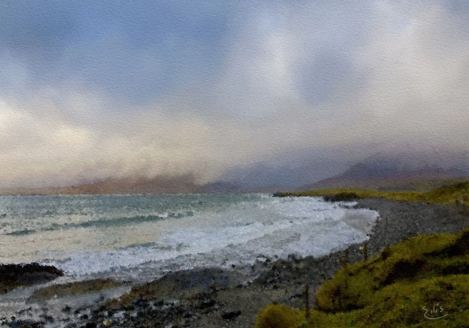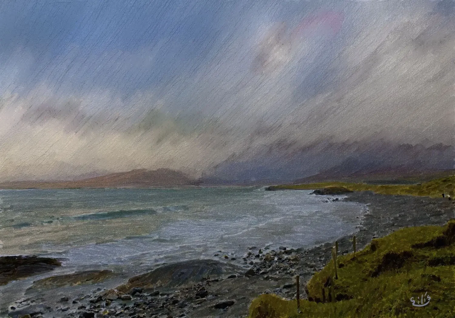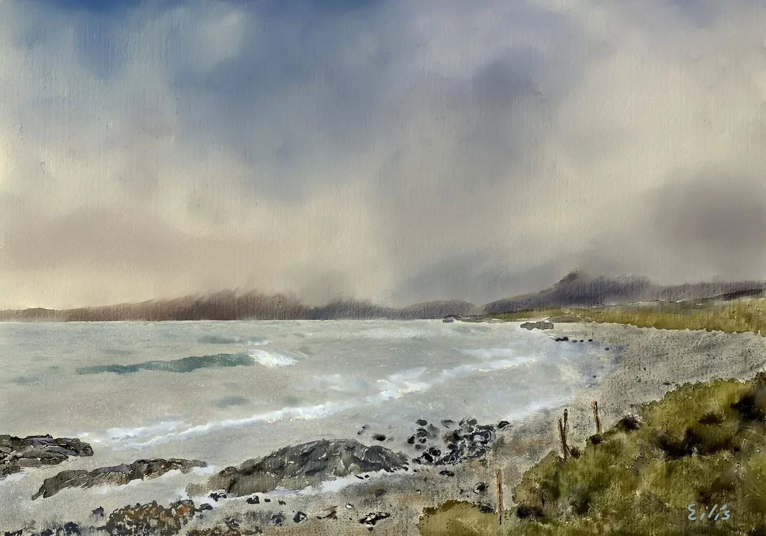 The same image of White Strand has been the inspirational source of these three works, realised with different techniques: watercolour, pastel and oil. Different media but one outcome: the unique sensation of serene loneliness of an unspoilt place, quite primaeval in its placid serendipity.