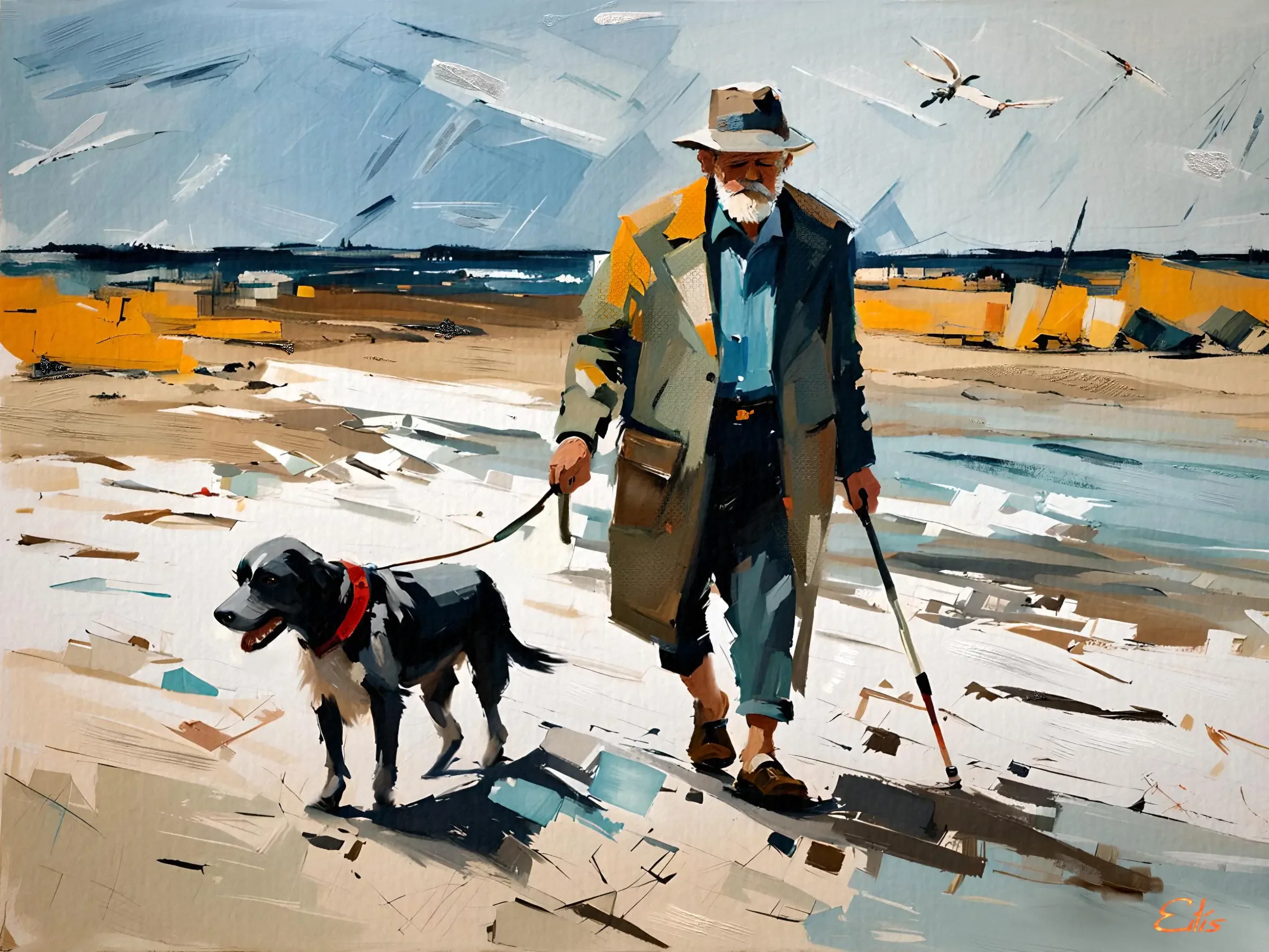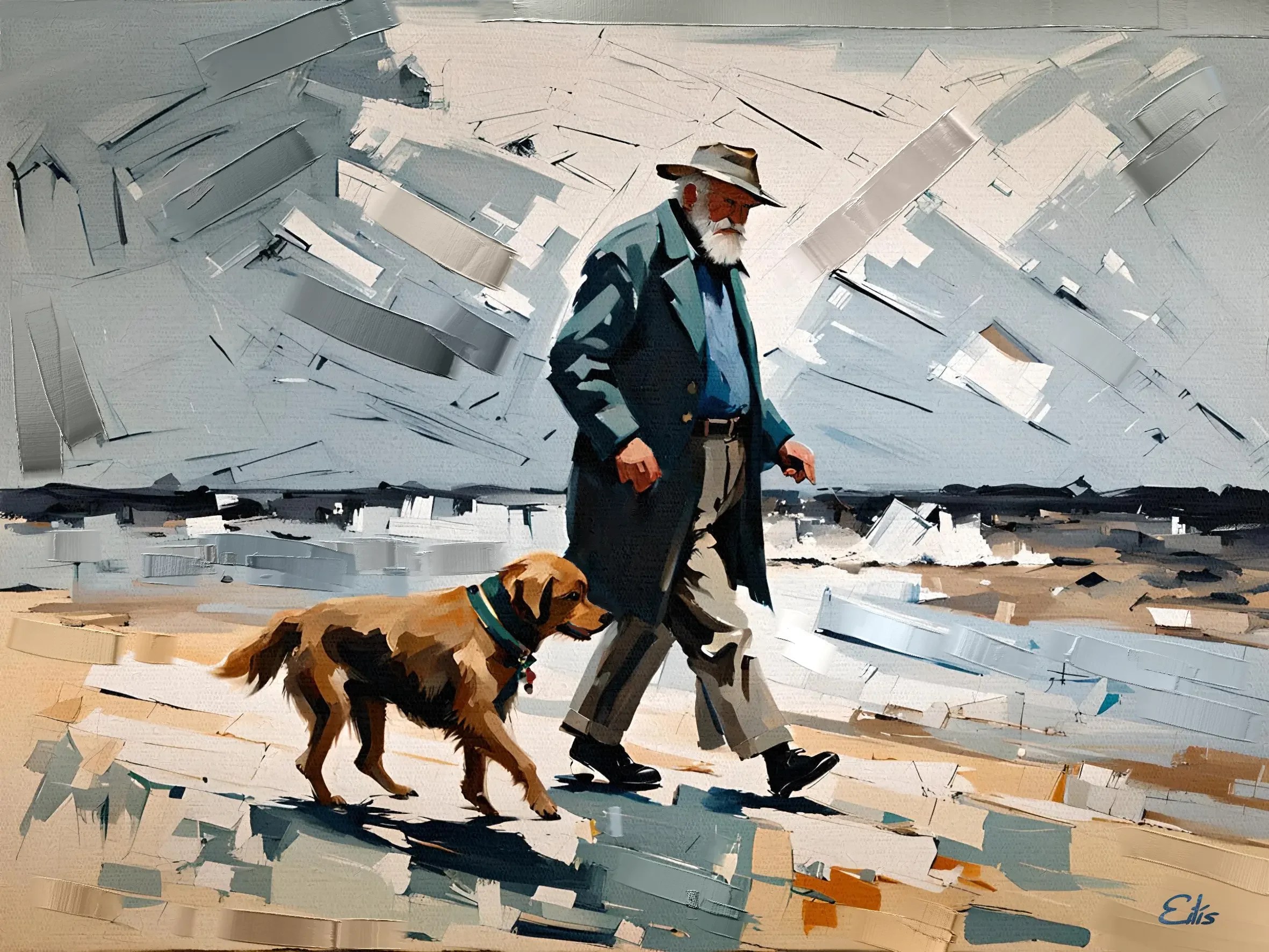The old man's footprints trail behind him in broken parallel with his dog's paw marks, twin signatures soon to be erased by the tide. His wool coat, the color of weathered driftwood, hangs heavy on stooped shoulders as he navigates the wet sand where surf meets shore. The dog, grey-muzzled like his master, keeps pace beside him, occasionally pressing a warm flank against the man's leg as if to steady him against the salt wind.